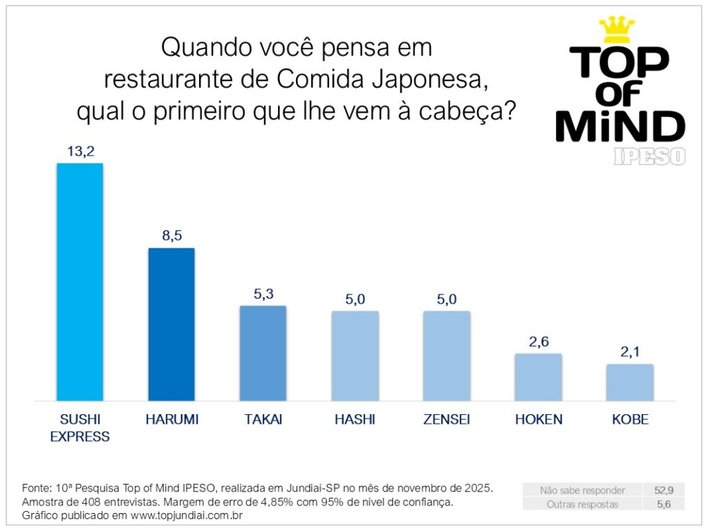 O restaurante Sushi Express lidera a categoria com 13,2% de menções, sustentado por duas unidades (Av. Jundiaí e Av. Nove de Julho) em Jundiaí e uma operação que iniciou atividades em 2006.