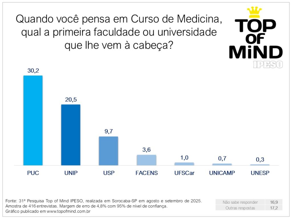 Em sua estreia na pesquisa Top of Mind, a categoria Curso de Medicina revela um retrato que combina tradição e novidade. A Faculdade de Medicina da PUC-SP, fundada em 1951 e reconhecida como o primeiro curso de medicina do interior do Brasil, lidera com 30,2% das menções espontâneas. A instituição mantém uma forte presença na memória do público, reflexo de sua história consolidada e de sua ligação duradoura com Sorocaba e região.