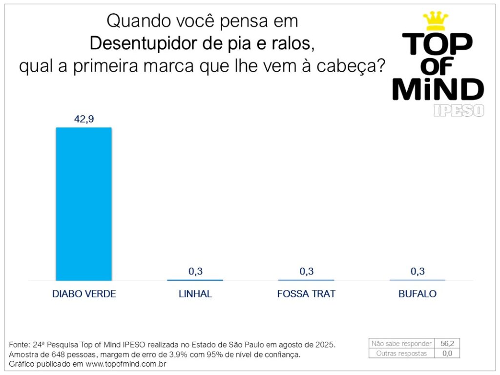 A marca Diabo Verde é praticamente o único nome lembrado pelo público paulista quando o assunto é desentupidor granulado para pias e ralos. Com 42,9% de menções, ele simplesmente não encontrou concorrência.
