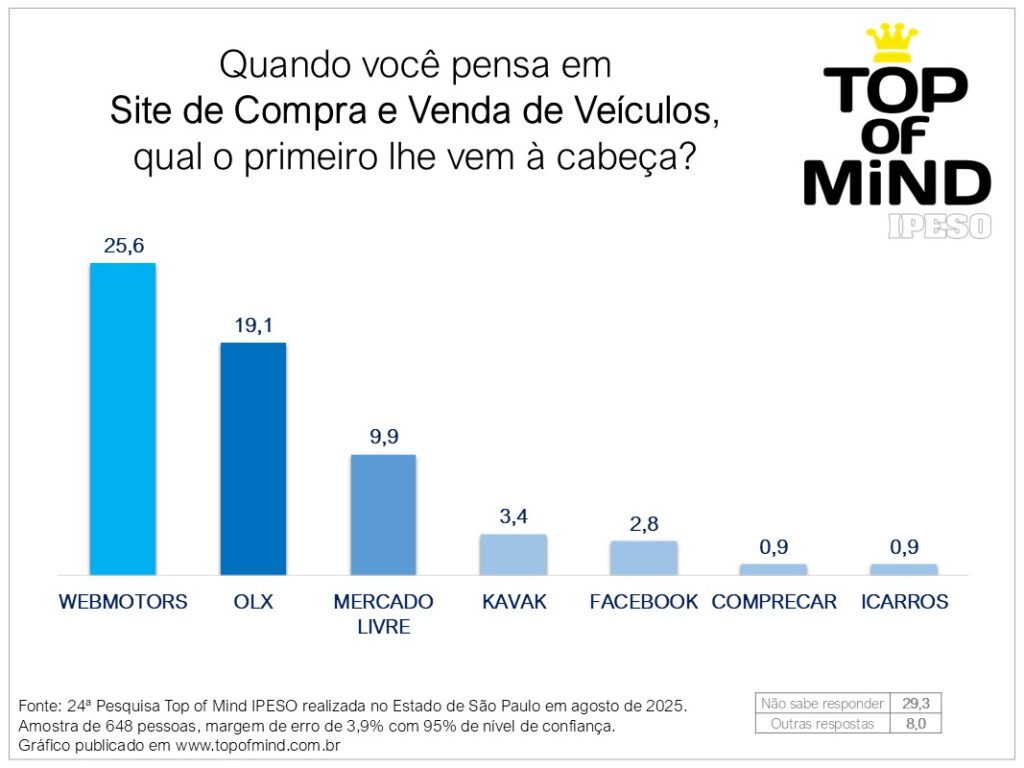 Kavak (3,4%), Facebook (2,8%), Comprecar (0,9%) e Icarros (0,9%) – todos com propostas bastante distintas entre si – disputam as demais posições do Top-7 em condição de empate técnico, dentro da margem da pesquisa.